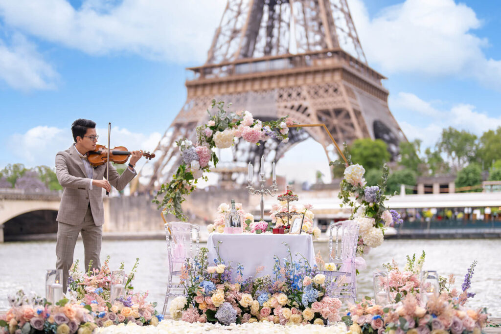 We provide all-inclusive marriage proposal packages and romantic celebration packages at iconic Paris locations — with setup, photography, coordination, and teardown included. We also supply decor, florals, and props for weddings, corporate events, and private parties.